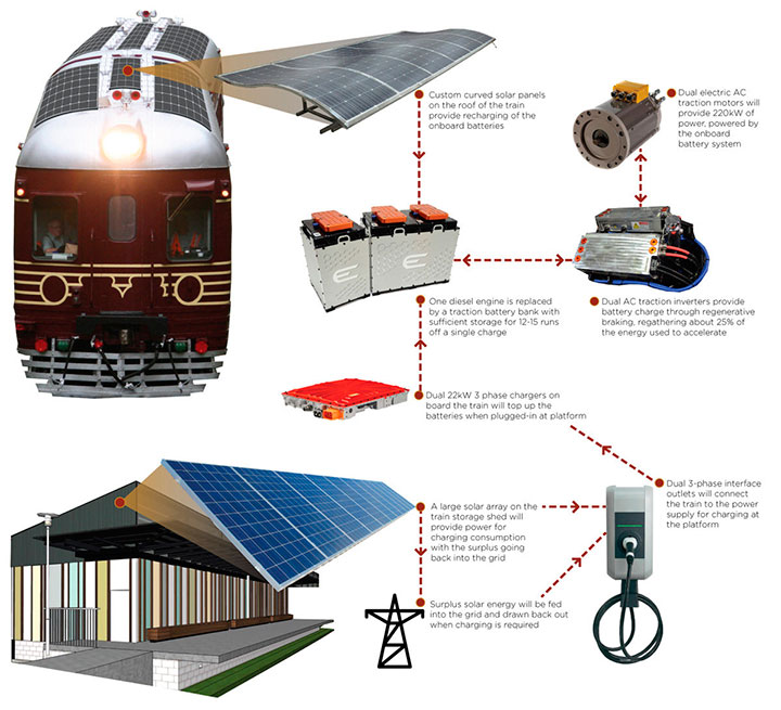 En principio, se tratará de un tren pequeño, del tipo “Alerce” que fabrica la compañía local Emepa para Trenes Argentinos y consta de un coche motor y un vagón, con capacidad para 240 pasajeros. Su característica central es que contará con paneles fotovoltaicos en los techos, para ser propulsado tanto por energía solar como diesel hidráulica.
